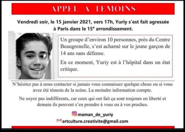 По их данным, нападение произошло 15 января, когда 15-летний Юрий с друзьями возвращался из колледжа. Недалеко от Эйфелевой башни, возле торгового центра Beaugrenelle, десяток неизвестных с металлическими палками, битами и ножами атаковали компанию студентов. Остальным удалось сбежать, а Юрия жестоко избили.