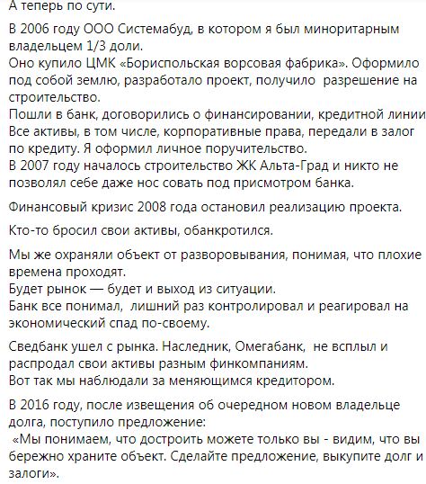 "Мы же охраняли объект от разворовывания, понимая, что плохие времена проходят. Будет рынок — будет и выход из ситуации. Банк все понимал, лишний раз контролировал и реагировал на экономический спад по-своему. Сведбанк ушел с рынка. Наследник, Омегабанк, не всплыл и распродал свои активы разным финкомпаниям", — говорит он.