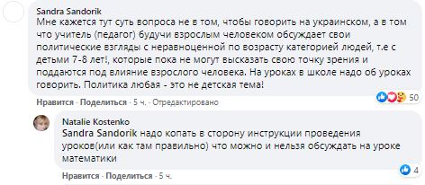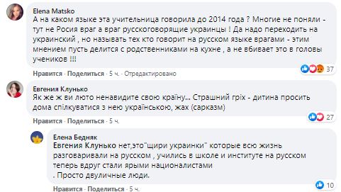 Одни пользователи пишут: "А на каком языке эта учительница говорила до 2014 года? Многие не поняли – тут не Россия враг, а враг – русскоговорящие украинцы! Да, надо переходить на украинский, но называть тех, кто говорит на русском языке, врагами – этим мнением пусть делится с родственниками на кухне, а не вбивает это в головы учеников!"