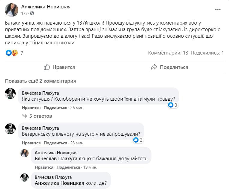 К слову, журналистка местного телеканала D1 News Анжелика Новицкая в комментариях сама призвала "ветеранское сообщество" присоединиться к завтрашней поездке в школу.