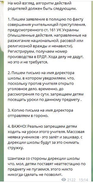 1. Пишем заявление в полицию по факту совершения учительницей преступления, предусмотренного ст. 161 УК Украины (Умышленные действия, направленные на разжигание национальной, расовой или религиозной вражды и ненависти). Регистрируем, получаем номер производства в ЕРДР. Хода делу не дадут, но это и не требуется.