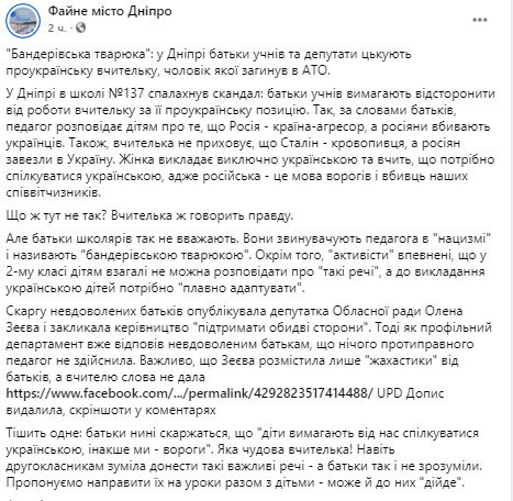 Пост активно стали расшаривать националистические группы. Они пишут, что в Днепре родители учеников и депутаты травят проукраинскую учительницу, муж которой погиб в АТО. Обвиняют педагога в "нацизме" и называют "бандеровской тварью".
