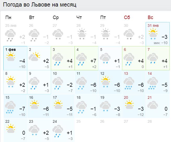 Судя по прогнозу Gismeteo, февраль будет щедрым на осадки во Львове. В первой половине месяца это будут дожди и мокрый снег. Примерно 13-14 февраля возможен обильный снегопад.
