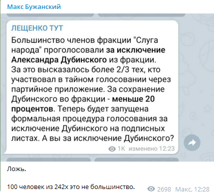 В свою очередь народный депутат из фракции "Слуга народа" Максим Бужанский, комментируя слова Лещенко в Телеграме, заявил, что 2/3 от проголосовавших через приложение - это всего 100 человек из 242, прошедших в Раду. То есть это не большинство фракции.