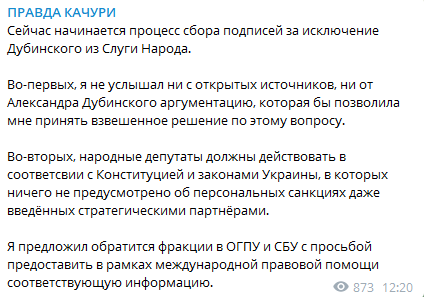 Коллега Бужанского по фракции Александр Качура добавил в своем Telegram-канале, что сбор подписей за исключение из фракции Дубинского уже начался.