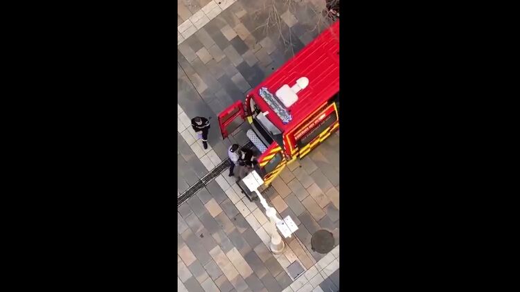 На кадрах видно, как полицейские заводят в спецавтомобиль худощавого мужчину, одетого во все черное.