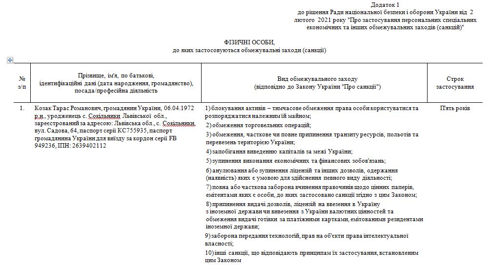 23:00 Вечером 2 февраля пресс-служба Офиса президента сообщила, что Владимир Зеленский подписал указ о введении санкций против народного депутата Украины из фракции "Оппозиционная платформа – За жизнь" Тараса Козака, а также восьми обществ с ограниченной ответственностью сроком на 5 лет, сообщила .