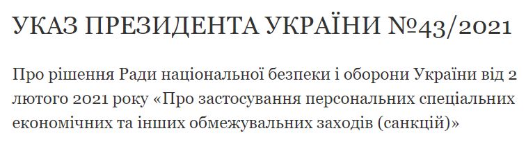 "В соответствии со статьей 107 Конституции Украины постановляю: ввести в действие решение Совета национальной безопасности и обороны Украины от 2 февраля 2021г "О применении персональных специальных экономических и других ограничительных мер (санкций)", - сказано в тексте указа.