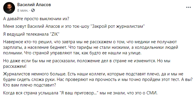 "Наверное кто-то решил, что завтра мы не расскажем о том, что медики не получают зарплаты, а население беднеет. Что тарифы не стали низкими, а холодильники людей полными. Что страной управляют так, как будто ее нашли на улице.