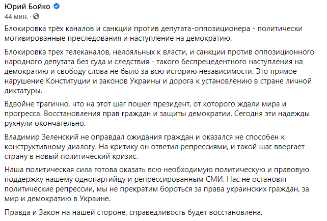 "Блокировка трех телеканалов, нелояльных к власти, и санкции против оппозиционного народного депутата без суда и следствия - такого беспрецедентного наступления на демократию и свободу слова не было за всю историю независимости. Это прямое нарушение Конституции и законов Украины и дорога к установлению в стране личной диктатуры.