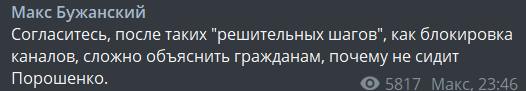"Согласитесь, после таких "решительных шагов", как блокировка каналов, сложно объяснить гражданам, почему не сидит Порошенко", - написал он в Телеграме.