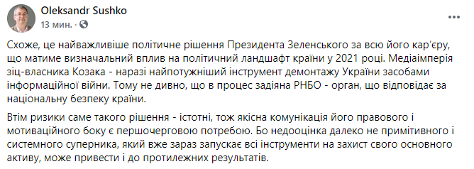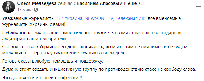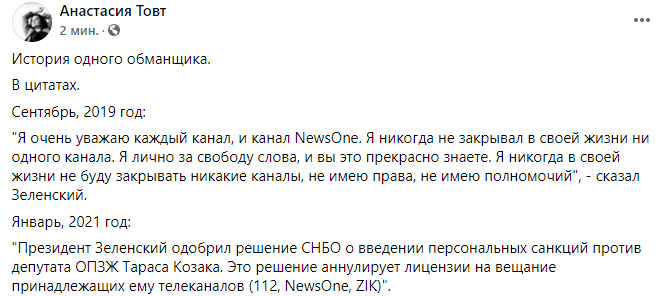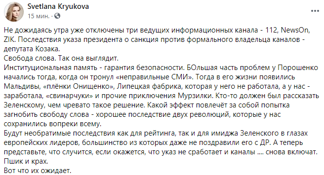 "Власть в лице президента Украины Владимира Зеленского приняла решение об уничтожении трех оппозиционных телеканалов: "112 Украина", NewsOne и ZiK, а также введении санкций против владельца холдинга – народного депутата Тараса Козака.