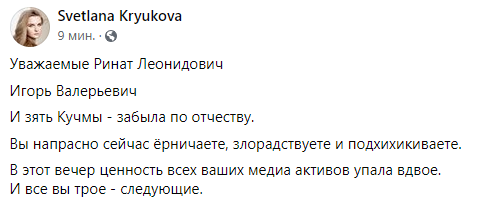 00:16  Замглавного редактора "Страны" Светлана Крюкова призывает остальных олигархов, у которых есть медиаактивы, приготовиться.