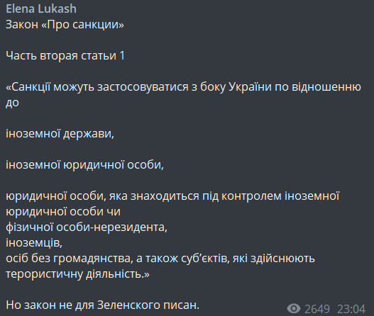 23:10  Юрист Елена Лукаш цитирует закон о санкциях. Там запрещено вводить их против граждан Украины.