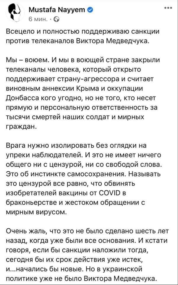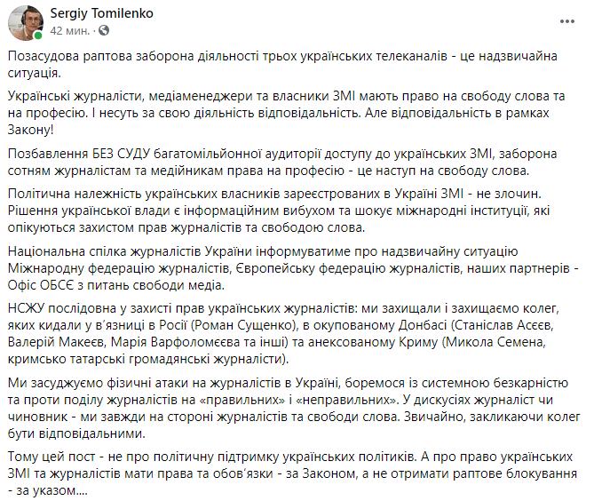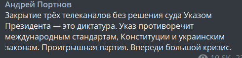 "Закрытие трёх телеканалов без решения суда Указом Президента — это диктатура. Указ противоречит международным стандартам, Конституции и украинским законам. Проигрышная партия. Впереди большой кризис".