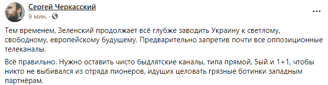 Всё правильно. Нужно оставить чисто быдлятские каналы, типа прямой, 5ый и 1+1, чтобы никто не выбивался из отряда пионеров, идущих целовать грязные ботинки западным партнёрам", - пишет блогер Сергей Черкасский.