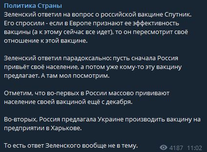 На вопрос о том, если в Европе признают ее эффективность вакцины, пересмотрит ли он своё отношение к этой вакцине, Зеленский ответил парадоксально: пусть сначала Россия привьёт своё население, а потом уже кому-то эту вакцину предлагает. А там мол посмотрим.