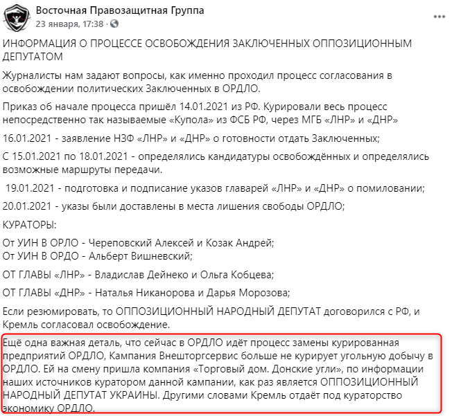 Пост об этом, со ссылкой на собственные источники, написала базирующаяся на подконтрольной Украине части Луганской области "Восточная правозащитная группа", финансируемая западными посольствами.