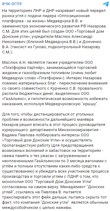 Еще 17 января Telegram-канал "ВЧК-ОГПУ" опубликовал инсайд об угольных схемах с "ДНР" и "ЛНР".