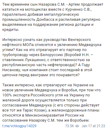 Через несколько дней, 21 января, Telegram-канал "Луганск оперативный", критикующий сепаратистов, также написал о причастности Медведчука к зарегистрированной в Ростове-на-Дону компании "Донские угли".