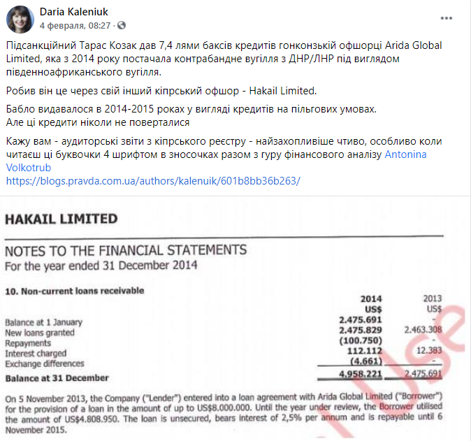 Она опубликовала еще старые данные "Украинской правды" о том, что Козак являлся бенефициаром кипрской компании, которая давала кредиты поставщикам южноафриканского угля в Украину в 2016 году.