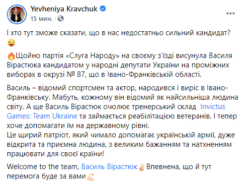"Василий - известный спортсмен и актер, родился и вырос в Киеве. Пожалуй, каждому он известен как самый сильный человек мира. А еще Василий Вирастюк возглавляет тренерский состав Invictus Games: Team Ukraine и занимается реабилитацией ветеранов. И теперь хочет помогать им на государственном уровне. Welcome to the team, Василий Вирастюк. Уверена, что и здесь победа будет за вами", - написала Кравчук.