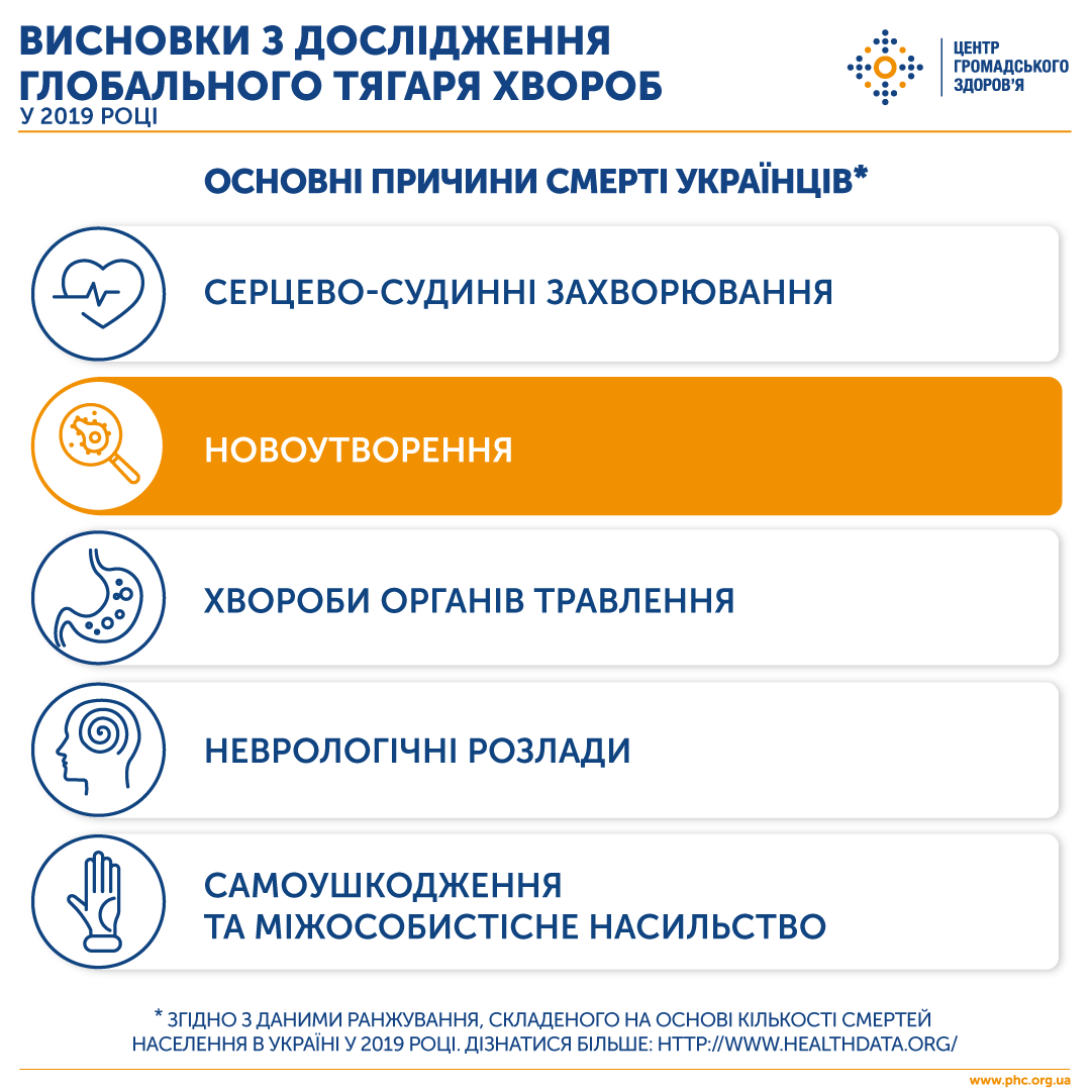 "В Украине новообразования входят в основные 5 причин смерти украинцев и являются вторыми крупнейшими убийцами граждан Украины. В национальном масштабе с 1990 года смертность от новообразований снизилась с 115 971 (18.6%) от общего количества смертей в 99 217 (14.1%) в 2019 году", - рассказали в ЦОЗ.