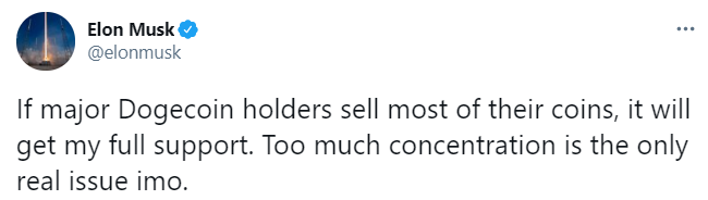 "Если крупные держатели Dogecoin продадут большую часть своих монет, это получит мою полную поддержку. Слишком высокая концентрация - это единственная реальная проблема, на мой взгляд", - написал Маск в микроблоге в Twitter в воскресенье.