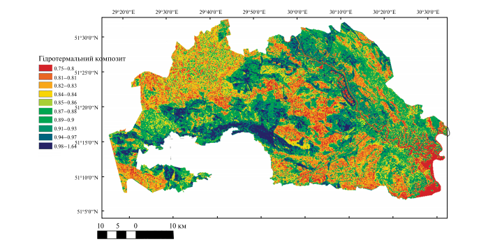 Скриншот: Карта гидротермального композита в пределах Чернобыльского биосферного радиационно-экологического заповедника по данным спутника "Landsat-8" от 24 апреля 2019.