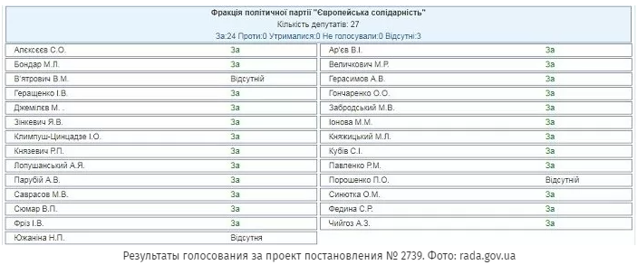 Всего за проект постановления проголосовало 295 народных депутатов. Из них 24 голоса принадлежат фракции "Европейская солидарность".