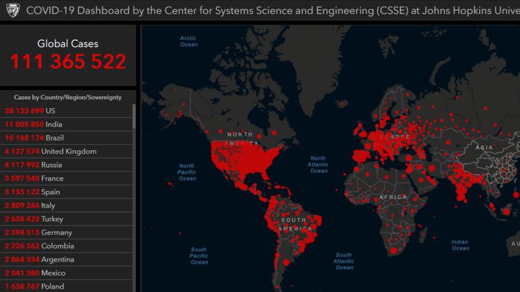 По данным на 22 февраля, число зараженных на Земле перевалило за 111 миллионов, фото: университет Дж. Хопкинса