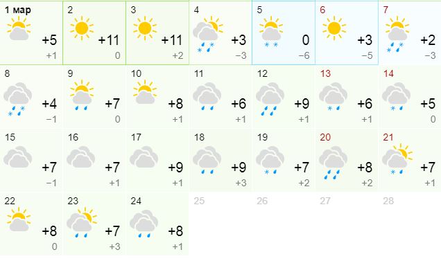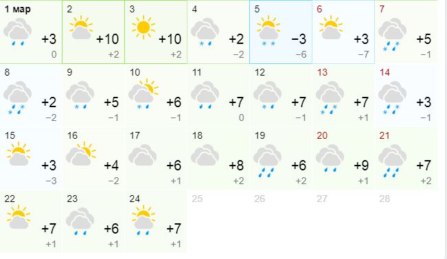 Март начнется с +10 и солнца. Такая погода продержится несколько дней, а 5-6 марта придет краткое похолодание с -3 днем и -7 ночью.