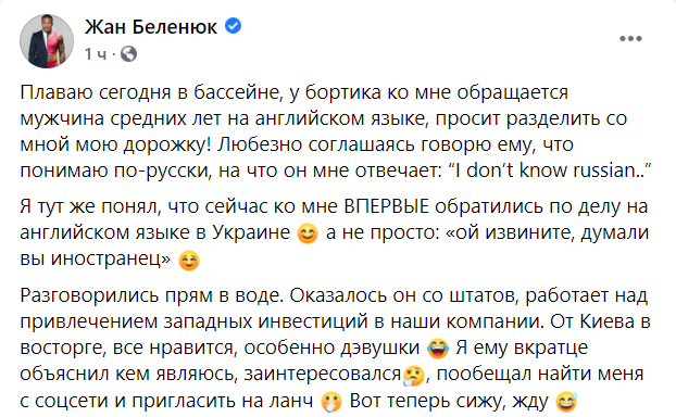 "... мне показалось, человек меня идентифицировал как иностранца, как со мной обычно бывает! Поэтому и уточнил ему, а как это по форме, "українською розумію", "по -русски понимаю", "по нашему разговариваю" - для меня не имеет значения! Смысл один - Я местный! Ни для кого не секрет, что общаюсь в быту на русском, хотя с удовольствием перехожу на украинский с украиноязычными людьми! Причём, естественно, не после того, как меня кто-то об этом попросил, а сам, по зову сердца", - подытожил Жан Беленюк.