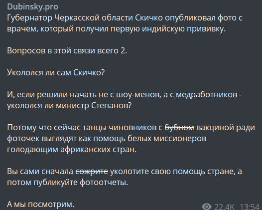 "Губернатор Черкасской области Скичко опубликовал фото с врачем, который получил первую индийскую прививку.