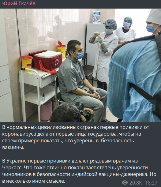 В Украине первые прививки делают рядовым врачам из Черкасс. Что тоже отлично показывает степень уверенности чиновников в безопасности индийской вакцины-дженерика. Но в несколько ином смысле", - пишет журналист из Одессы Юрий Ткачев.