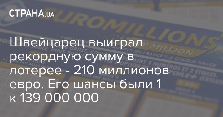 В пятницу вечером, 26 февраля, игрок из Швейцарии выиграл рекордные 210 млн евро в лотерее Euromillions. Специалисты оценили, что шансы сорвать джекпот были 1 к 139 млн.