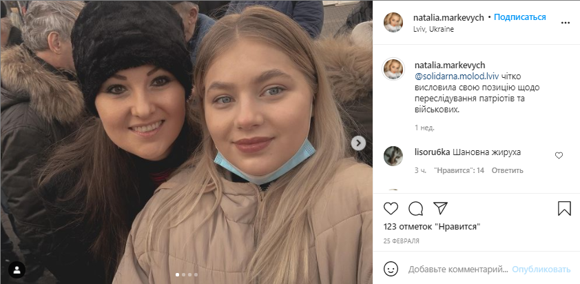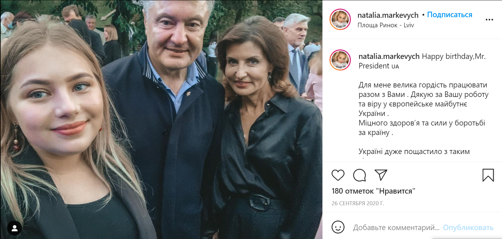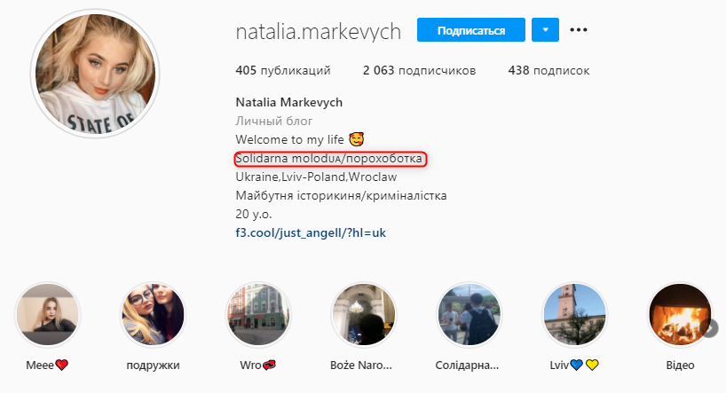 Она активно ведет свою страницу в Instagram, где не скрывает свои политические взгляды, называя себя "порохоботкой" и публикуя совместные фото с политиками - Софьей Федыной, Порошенко и его семьей, а также экс-спикером Рады Андреем Парубием.