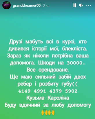 Также Витошинский опубликовал в сториз информацию о нанесенном ущербе - это 30 тысяч гривен. Аппаратура был арендована. Парень сбросил номер карты своей девушки с просьбой о помощи.