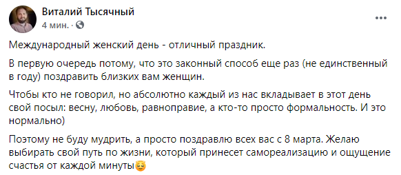 "Международный женский день - отличный праздник. В первую очередь потому, что это законный способ еще раз (не единственный в году) поздравить близких вам женщин. Чтобы кто не говорил, но абсолютно каждый из нас вкладывает в этот день свой посыл: весну, любовь, равноправие, а кто-то просто формальность. И это нормально) Поэтому не буду мудрить, а просто поздравлю всех вас с 8 марта. Желаю выбирать свой путь по жизни, который принесет самореализацию и ощущение счастья от каждой минуты" - заявил журналист.