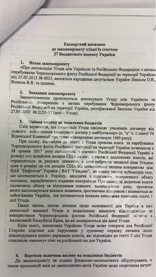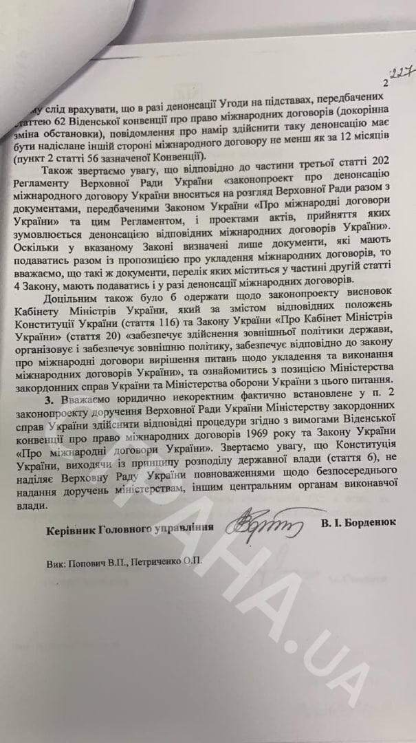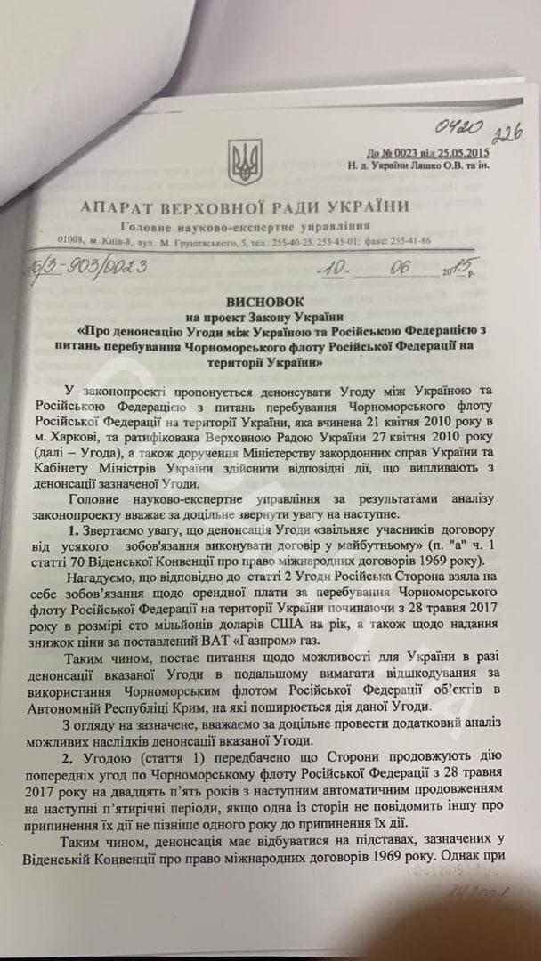 Он также показал "Стране" выводы главного экспертного управления Рады от 2015-го года, где говорится, что соглашения денонсировать нельзя (такой законопроект тогда был подан в парламент). В частности, против документа выступал и Минфин.