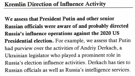 В докладе говорится, что "Путин контролировал деятельность Андрея Деркача, украинского законодателя, который играл важную роль в российских действиях по влиянию на выборы. Деркач связан как с российскими чиновниками, так и спецслужбами".