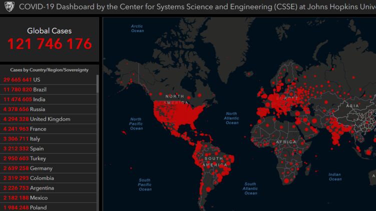 По состоянию на утро 19 марта, число зараженных в мире приближается к 122 миллионам, фото: arcgis.com