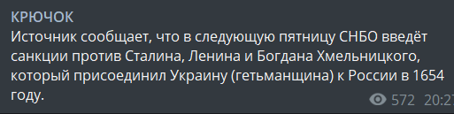 "Источник сообщает, что в следующую пятницу СНБО введёт санкции против Сталина, Ленина и Богдана Хмельницкого, который присоединил Украину (гетьманщина) к России в 1654 году" - иронизирует заместитель главного редактора "Страны" Светлана Крюкова.