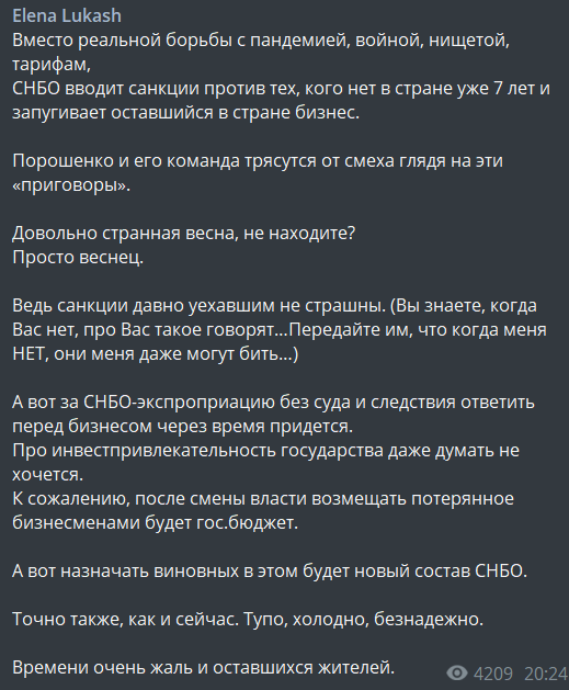 "Вместо реальной борьбы с пандемией, войной, нищетой, тарифам, СНБО вводит санкции против тех, кого нет в стране уже 7 лет и запугивает оставшийся в стране бизнес.