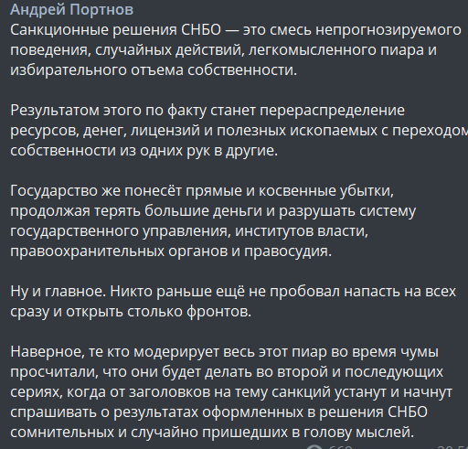 Наверное, те кто модерирует весь этот пиар во время чумы просчитали, что они будет делать во второй и последующих сериях, когда от заголовков на тему санкций устанут и начнут спрашивать о результатах оформленных в решения СНБО сомнительных и случайно пришедших в голову мыслей", - пишет юрист Андрей Портнов.