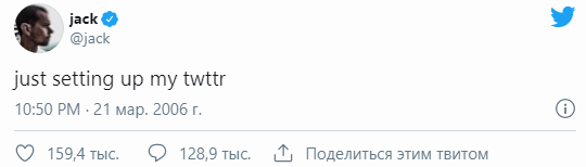 Отметим, что первая публикация в социальной сети Твиттер была короткой - "just setting up my twttr" (Просто настраиваю свой твиттер - ред.).