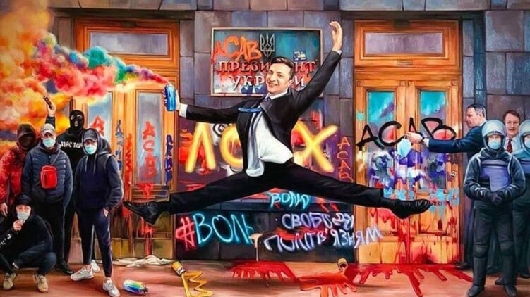 На картине изображен разрисованный радикалами фасад здания Офиса президента. В центре, на фоне надписи "Лох" - человек, похожий на президента Владимира Зеленского. Он, улыбаясь, подпрыгивает и держит в руках дымовую шашку с цветным дымом. На втором плане с одной стороны от него - участники погрома на Банковой, с другой - полиция, человек, похожий на замглавы МВД Антона  Геращенко и еще один - похожий на  мэра Киева Виталия Кличко.
