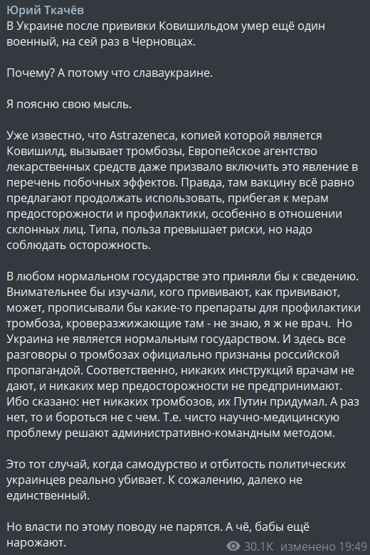 Но Украина не является нормальным государством. И здесь все разговоры о тромбозах официально признаны российской пропагандой. Соответственно, никаких инструкций врачам не дают и никаких мер предосторожности не предпринимают. Ибо сказано: нет никаких тромбозов, их Путин придумал. А раз нет, то и бороться не с чем. Т. е. чисто научно-медицинскую проблему решают административно-командным методом", – пишет одесский журналист Юрий Ткачев.