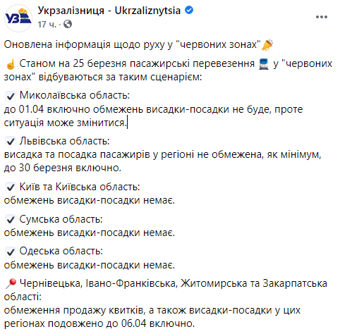 Во Львовской области, которая сейчас также в "красной" зоне, высадка и посадка пассажиров не ограничены как минимум по 30 марта включительно.
