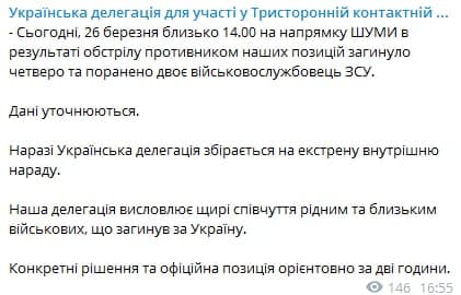 "Сегодня, 26 марта около 14:00 на направлении Шумы в результате обстрела противником наших позиций погибли четыре и ранены двое военнослужащий ВСУ", - говорится в сообщении